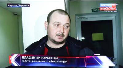 Затем в студии были показано интервью с Владимиром Горбенко – капитаном российского судна «Норд», которого сейчас судят на Украине. Как известно, в конце марта российский сейнер «Норд» был захвачен в нейтральных водах Азовского моря украинским вооруженным кораблем. Сегодня сейнер находится в украинском Бердянске, всем членам команды предъявляются абсурдные обвинения, в частности – в незаконном проникновении в «украинский» Крым (при том, что все моряки являются жителями Крыма). Владимир Горбенко уже перенес два гипертонических криза.