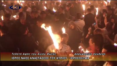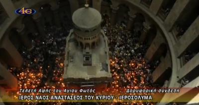 Трансляцию схождения Благодатного огня в Иерусалиме в Храме Гроба Господня, которую вел 7 апреля 2018 года греческий телеканал Е4 можно посмотреть по ссылке "Царьград ТВ"