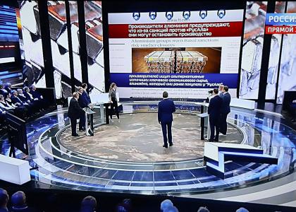В студии был показан сюжет о негативном влиянии американских санкций против России на европейскую экономику: забили тревогу европейские компании, потребляющие российские алюминий и глинозем. Они будут вынуждены искать других поставщиков и заново сертифицировать их продукцию, на это уйдет немало времени. Значит, в какой-то момент эти производства могут остановиться из-за нехватки сырья. Поэтому европейцы намерены просить США о смягчении санкций в отношении своих поставщиков из России, сообщают СМИ. Инициатором выступает Франция, но и немцы готовы присоединиться.
