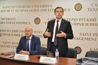Перед началом лекции Ю. В. Афонин познакомился с ректором СПбУТУиЭ О. Г. Смешко, а также посетил музей, рассказывающий об истории создания и становления этого высшего учебного заведения.