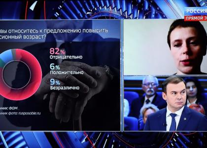 Обсуждалась тема возможного повышения пенсионного возраста. В студии были обнародованы результаты свежего социологического исследования ФОМ, согласно которому 82% жителей России отрицательно относятся к идее повышения возраста выхода на пенсию, лишь 6% – положительно и 9% – безразлично. Казалось бы, мнение общества по этому вопросу предельно ясно. Но ведущие и часть гостей программы тут же взялись усердно доказывать, что повышение пенсионного возраста строго необходимо, и в нём нет ничего страшного.