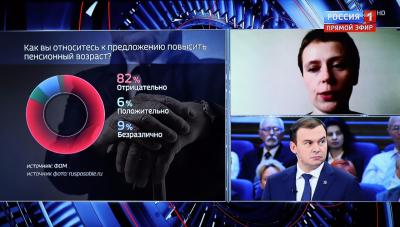 Обсуждалась тема возможного повышения пенсионного возраста. В студии были обнародованы результаты свежего социологического исследования ФОМ, согласно которому 82% жителей России отрицательно относятся к идее повышения возраста выхода на пенсию, лишь 6% – положительно и 9% – безразлично. Казалось бы, мнение общества по этому вопросу предельно ясно. Но ведущие и часть гостей программы тут же взялись усердно доказывать, что повышение пенсионного возраста строго необходимо, и в нём нет ничего страшного.