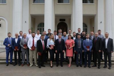 Завершилось вручение дипломов коллективным фотографированием и неформальным общением Дмитрия Новикова с выпускниками партийной школы.