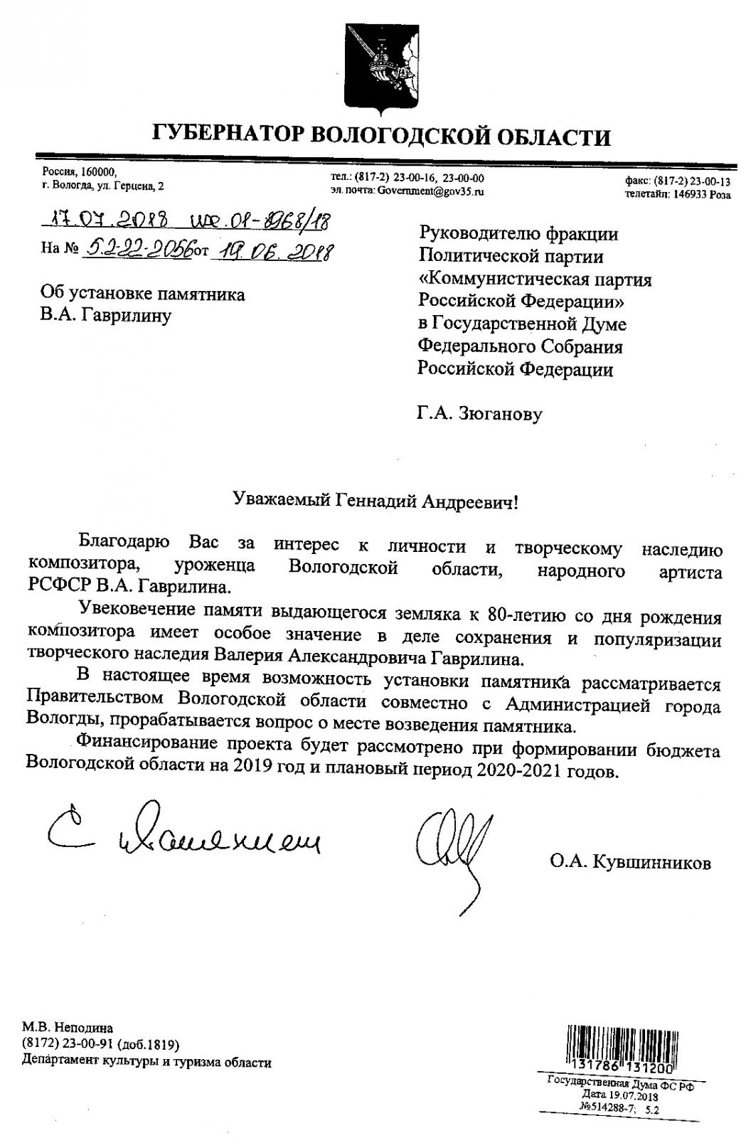 Принимая во внимание большой талант Валерия Гаврилина, творчество которого потрясло Дмитрия Шостаковича и многих мэтров музыкального искусства, Геннадий Зюганов незамедлительно направил письмо губернатору Вологодской области Олегу Кувшинникову. В письме к главе региона лидер КПРФ отметил, что творчество Гаврилина – это значительная веха в истории не только отечественной, но и мировой музыкальной культуры. Г.А. Зюганов подчеркнул: «Истинный патриот, великий гражданин своей Родины, он с редкой полнотой, мощью и убедительностью выразил в своей музыке трагедию русского XX века и беспримерный подвиг народа, как в военные годы, так и в мирные дни». В своем письме Председатель ЦК КПРФ выразил надежду на то, что жители Вологодской области получат возможность гордиться памятником своему великому земляку Валерию Александровичу Гаврилину.