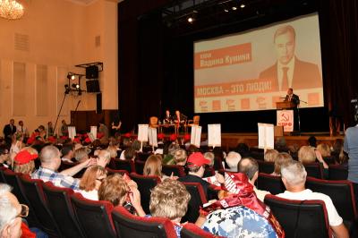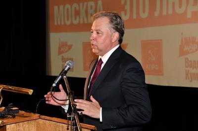 Затем перед собравшимися ввступил кандидат в губернаторы Москвы от КПРФ В.В. Кумин. "Я горжусь тем, что вы меня выдвинули", - заявил он. Кандидат-коммунист рассказал о том, каковы были условия на старте кампании, отметив, что всего за два месяца была проведена огромная работа. И встречи с москвичами убедили в том, что в городе есть масса проблем, и что мэрию не интересует жизнь простых горожан. "Наш тезис: Москва - это не бизнес, Москва - это люди", - подчеркнул кандидат. Он отметил, что штаб кандидата направил более 1000 обращений по факту озвученных москвичами проблем. При этом на каждой встрече с избирателем присутсвует целая группа депутатов-коммунистов, а также руководитель аппарата фракции КПРФ в Госдуме Нина Останина.
