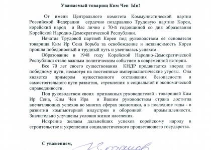 В своем приветственном слове к высоким гостям заместитель Председателя ЦК КПРФ, первый заместитель Председателя Комитета Госдумы по международным делам Дмитрий Георгиевич Новиков выразил признательность, поздравил от руководства Коммунистической партии РФ всех присутствующих со знаменательной датой и заверил, что Коммунистическая партия Российской Федерации будет развивать и укреплять дружбу, сотрудничество и взаимопомощь с народом Корейской Народно-Демократической Республики.