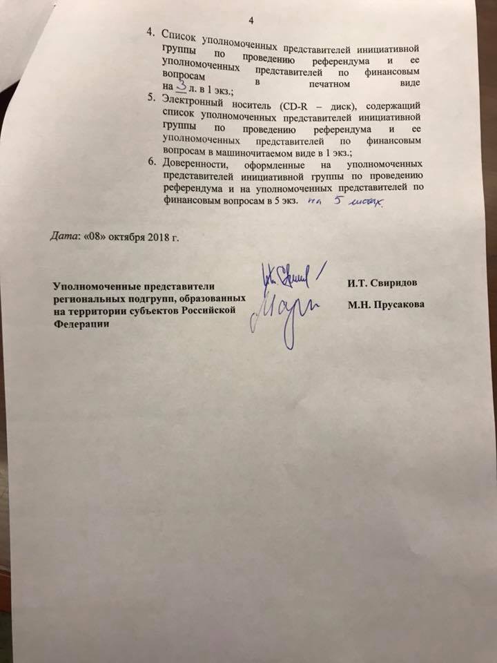 В свою очередь, секретарь ЦИК Майя Гришина сообщила, что Центризбирком РФ получил от представителя партии «Справедливая Россия» Ильи Свиридова документы о регистрации инициативной группы по проведению пенсионного референдума