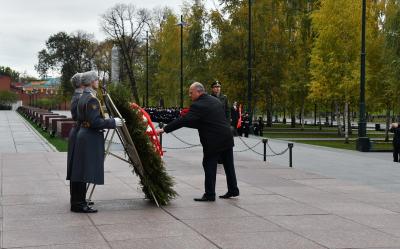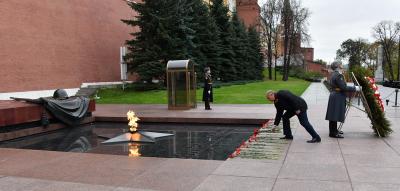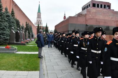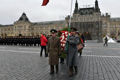 Затем колонна под красными знаменами направилась к Могиле Неизвестного солдата, где также состоялось возложение цветов. После этого, символизируя связь поколений, перед участниками юбилейного мероприятия торжественным маршем прошли воспитанники кадетских корпусов и юнармейцы. Цветы были также возложены к памятнику Маршалу Победы Георгию Константиновичу Жукову.