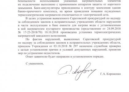 В пришедшем на днях ответе сообщается, что администрацией ФКУ ЛИУ-3 УФСИН России по Саратовской области достигнута договорённость о пополнении библиотечного фонда в 2018 году за счёт пожертвований Русской Православной Церкви, а в банных ёмкостях для нагрева воды установлены термоэлектрические нагреватели заводского производства взамен кустарно изготовленных. Кроме того, по фактам выявленных нарушений назначена служебная проверка.