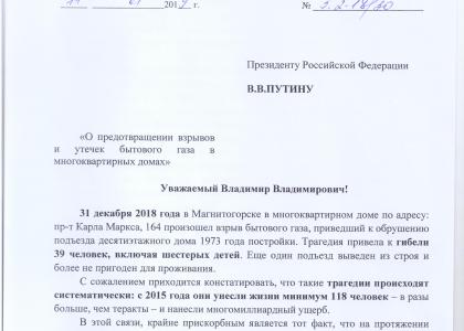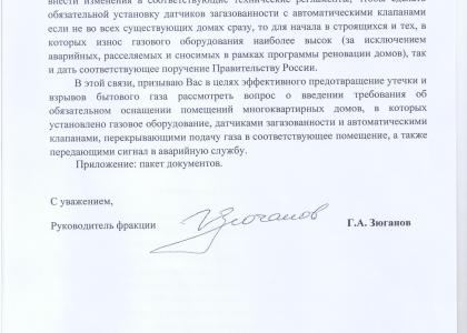 Председатель ЦК КПРФ, Руководитель фракции КПРФ в Государственной Думе Г.А. Зюганов направил Президенту Российской Федерации В.В. Путину обращение «О предотвращении взрывов и утечек бытового газа в многоквартирных домах».