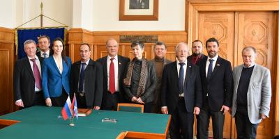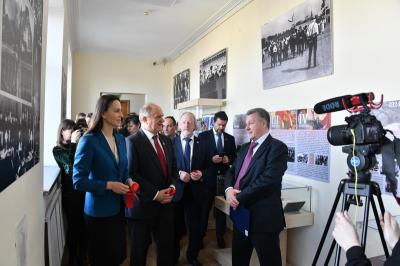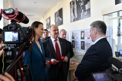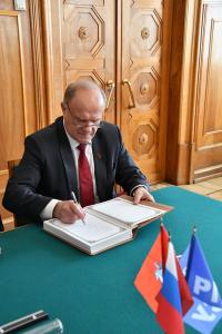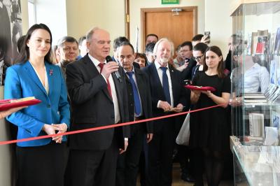 Затем Г.А. Зюганов принял участие в открытии Музея Коминтерна в РГСУ. Его центральное звено – сохранившийся кабинет Г.М. Димитрова. Геннадию Андреевичу было доверено перерезать ленточку открывшегося музея, он также оставил запись в книге почетных гостей музея.
