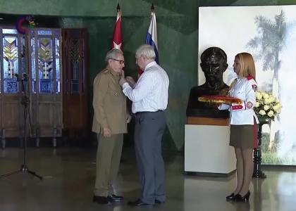 "Позвольте мне вручить почетный нагрудный знак и диплом лауреата Ленинской премии первому секретарю ЦК Компартии Кубы Раулю Кастро Рус за выдающийся вклад в практику социалистического строительства, за деятельность, способствующую утверждению в жизни общества принципов справедливости, гуманизма и социального прогресса, за верность идеалам социализма и Кубинской Революции, за личную роль в международной борьбе с антикоммунизмом и колониализмом и последовательную позицию в деле укрепления российско-кубинской дружбы", - сказал Мельников.