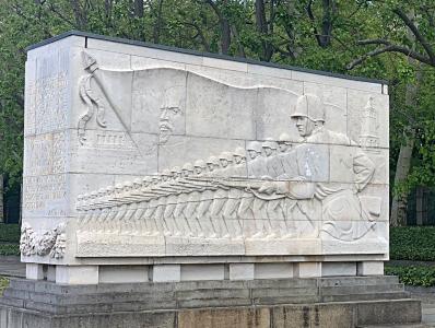 Сталин, однако, присутствует в мемориале Трептов-парка. На стены шестнадцати символических каменных саркофагов, также являющихся частью мемориала, нанесены цитаты Сталина. На русском и на немецком языках. Простыми словами наш Верховный Главнокомандующий ясно рассказывает о чудовищной сути фашизма и о ключевой роли советского народа в победе над мировым злом.