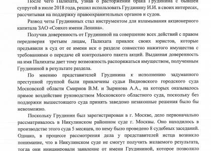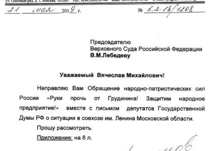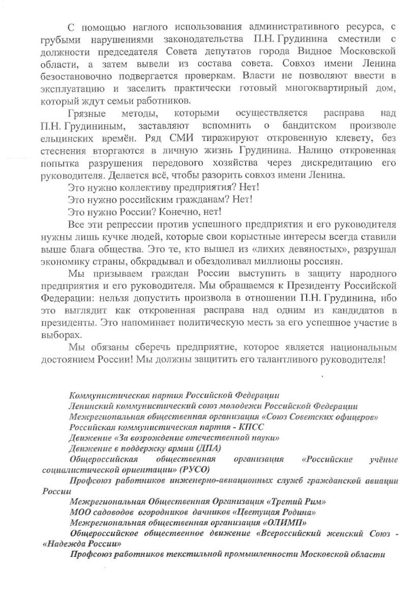 - Председатель ЦК КПРФ Г.А. Зюганов, выступая с трибуны Государственной Думы, официально обратился с требованием остановить произвол в отношении уникального предприятия, каковым является совхоз имени В.И. Ленина, и оградить от бандитских нападок его руководителя – Павла Николаевича Грудинина.