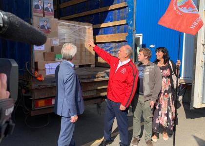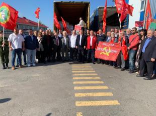 Утром 26 августа, в канун Дня знаний, коммунисты Московской области, Москвы, Тулы, Воронежа, Брянска, республики Марий Эл и других городов России отправили из подмосковного Совхоза им. Ленина юбилейный 80-й гуманитарный конвой в Новороссию. Две многотонные фуры снарядили самым необходимым для донецких школьников. На церемонии отправки гуманитарного груза выступил Председатель ЦК КПРФ Г.А. Зюганов.