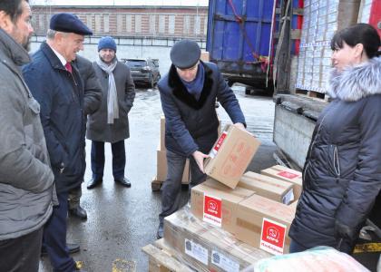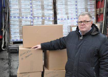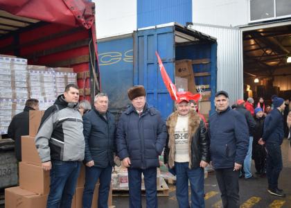 - Уважаемые товарищи! Все наши 82 гуманитарных конвоя идут от души. В сегодняшнем конвое участвует вся наша партия: от Якутии до западных и южных территорий нашей страны. Мы сегодня отправляем на Донбасс три 20-тонные фуры. Большую часть, конечно, собрала Московская областная организация КПРФ. Но, помимо неё, я хочу сказать ещё и о наших товарищах из сельскохозяйственной Ассоциации – это они прислали 6 тонн конфет и 3,5 тонны печенья, масло, сахар.