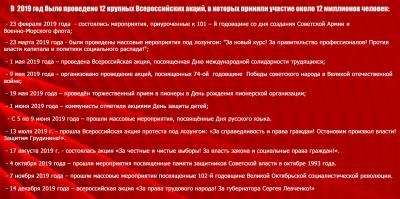 Только КПРФ решительно откликается на проблемы и запросы общества. Уличный протест, как способ выражения требований и защита прав народа, сегодня стал одной из главных и наиболее эффективных форм в работе КПРФ. Наша партия отдает себе отчет, что, овладев улицей, мы формируем мощную базу для давления на власть и осуществления своей программы. КПРФ и ее Общероссийский Штаб по координации протестного движения ежегодно проводят 12-14 многотысячных протестных акций по наиболее актуальным, злободневным проблемам жизни. В составе Штаба на постоянной основе работают: Движение "Дети войны" (председатель Н.В.Арефьев), в организацию входит три миллиона только аффилированных членов,а всего она выражает интересы 12 миллионов ветеранов, чью юность опалил огонь великой войны с гитлеровским фашизмом, офицерское Движение "В поддержку Армии", лидером которой является боевой генерал В.И.Соболев, Движение "За возрождение отечественной науки", возглавляемое видным ученым-математиком, академиком РАН Б.С.Кашиным, Профсоюзы работников летного состава "ПЛС", "инженерных авиационных служб "ПРИАС ГА России", авиаработников радиолокации, радионавигации и связи "ПАРРиС"и многие другие. Всего в составе Штаба работает более 50 боевитых и деятельных общественных организаций, представляющих весь спектр направлений общественного пространства страны. Работа в составе Штаба для них является настоящей школой политической борьбы. Партия вооружает каждого участника своей Программой, опытом и методикой решения проблем, в ответ получая поддержку, объективную обратную информацию и оперативный анализ.