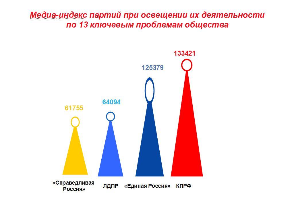 Кроме того, КПРФ лидирует по медиа-индексу (позитивность освещения в СМИ) в контексте указанных выше важнейших для общества проблемных тем. А это означает, что даже формальное лидерство «Единой России» в инфополе по 8 из 13 актуальным проблемным позициям противоречивого качества. Здесь партию власти зачастую упоминали в негативной коннотации, а не только позитивной или нейтральной.