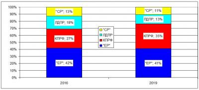 Что касается соответствия риторики партий общественному запросу, то пока лидерство «ЕР» сохраняется, но оно уже не столь бесспорно. Доля «ЕР» в общем объеме информсообщениях по ключевым вопросам национальной повестки дня немного упала – 41% в 2019 г. против 42% в 2016 г. Доля упоминаний КПРФ в публикациях по актуальным для населения проблемам выросла до 35,1% (рост на 7%). А вот ЛДПР не совсем «попадала» в «яблочко» доминирующих народных запросов: доля партии Жириновского упала с 18% до 10%. У «Справедливой России» также падение доли в атуальном событийном инфополе - с 13% до 11%.