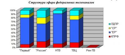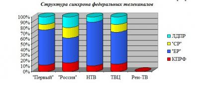 - Наибольшее количество времени коммунистам (а также «эсерам» и ЛДПРовцам) предоставил «Россия» (16% синхрона у КПРФ, 19% у «СР», 20% у ЛДПР и 45% у «ЕР»).