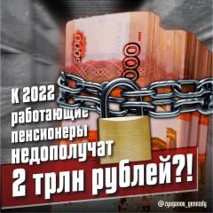 «Эксперты подсчитали, что за последние 5 лет работающие пенсионеры недополучили 1 трлн рублей! Данная сумма, которая к 2022 г. увеличится до 2 трлн, образовалась из-за заморозки индексации пенсий. Этот грабеж средь бела дня власть объясняет нехваткой денег. Да у нас денег - куры не клюют! Только золотовалютных резервов более 45 трлн руб! К тому же лишь за 2020 г. правительство не сумело освоить целый триллион бюджетных средств! При всем при том олигархи продолжают богатеть! Считаю, что власть обязана немедленно отменить позорный запрет на индексацию пенсий работающих пенсионеров и выплатить им весь долг!»