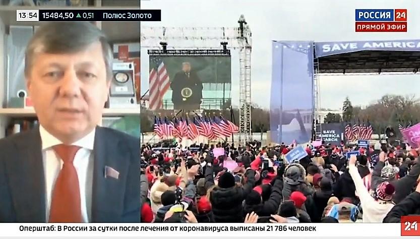 Ведущий телеканала «Россия 24» Александр Кареевский обратился к трём экспертам с просьбой прокомментировать ситуацию в США и её влияние на другие страны. По словам Дмитрия Новикова, все эти эпизоды свидетельствуют о глубине раскола американского общества: «Ползучий, хоть и оформленный под видом выборов переворот завершился. Но это не означает смерти трампизма – как явления, как попытки национального капитала «пободаться» с глобальным капиталом в интересах определённых слоёв американского общества. Мы хорошо понимаем, что здесь нет раскола сугубо по принципу личных симпатий и антипатий к Трампу. Многие американцы, не являясь его ярыми фанатами, голосуют за него как за воплощение некого курса развития Соединённых Штатов. Ну а когда страсти накалены, дело доходит до таких шизофренических ситуаций, как отмена рейсов, снятие кого-то с самолёта и прочее».