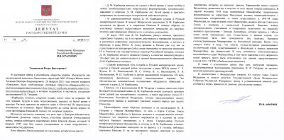 В депутатском запросе, который депутат Государственной Думы, заместитель Председателя ЦК КПРФ Ю. В. Афонин направил Генеральному прокурору Российской Федерации И. В. Краснову, содержатся исторические и юридические аргументы, указывающие на полную несостоятельность позиции господина Титарева. В частности, указывается, что, вопреки фантастическим историческим представлениям омского бизнесмена, Д. М. Карбышев никогда не служил в белой армии. А схожий с карбышевским жизненный путь – служба в Русской императорской армии, участие в Первой мировой войне, вступление в ряды РККА – имеют Г. К. Жуков, К. К. Рокоссовский, И. С. Конев, В. А. Василевский, Р. Я. Малиновский, Ф. И. Толбухин и другие выдающиеся полководцы XX века, являющиеся нашими национальными героями. Это обстоятельство дополнительно подчеркивает абсурдность обвинений в «измене» в адрес Д. М. Карбышева.