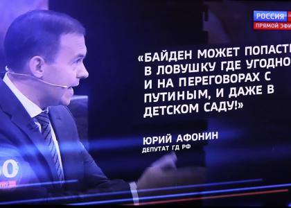 Одной из тем обсуждения в студии стала вероятная встреча президентов России и США. Мировая и особенно американская пресса обсуждают эту еще не назначенную встречу с таким азартом, словно это бой двух претендентов на чемпионский пояс по боксу. Это старая американская традиция: подавать политические реалии в терминах спортивного состязания – так гражданам США понятнее и интереснее. На телеканалах США на полном серьезе выступают разномастные политики с советами Байдену, как не попасть в «ловушки Путина». Гостям студии «60 минут» показали ролик, где бывшая советница Трампа пугала Байдена хитростью и коварством российского президента.