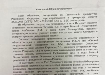 Ответ на депутатский запрос пришел из прокураторы Омской области. Прокуроры привлекли в качестве экспертов юриста и историка, доцентов Омского госуниверситета. И два кандидата наук не увидели в «историческом открытии» Титарева ничего оскорбительного для памяти Карбышева, ничего «реабилитирующего нацизм» в восхвалении гитлеровского пособника Маннергейма. Говорят, высказывания насчет Карбышева не о Великой Отечественной, а о Гражданской, поэтому ничего тут нет оскорбительного. То есть госпожа историк Ротермель не против того, что ее героический земляк Дмитрий Михайлович Карбышев – изменник на том основании, что «перешел из белой армии в Красную»? Притом, что в белой армии он никогда не служил – только в царской? И вступил в РККА год спустя после отречения царя, не нарушив присяги? А маршал Маннергейм, по мнению экспертов, вовсе не пособник нацистов, потому что его не назвал нацистским преступником Нюрнбергский трибунал. То, что он помогал Гитлеру блокировать Ленинград, – так это не в счет, видимо. Тревожно за студентов ОмГУ – чему их там учат «доценты с кандидатами»?