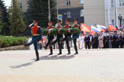 Собравшиеся почтили память погибших в годы Великой Отечественной войны минутой молчания, а затем возложили «Гирлянду Славы» и цветы к постаменту стелы.