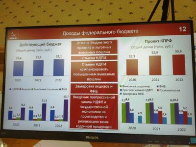 Владимир Иванович также поднял тему федерального бюджета и озвучил предложения КПРФ по всем важным вопросам, которые как правило не получают поддержки в Госдуме, принимающей решения большинством голосов партии власти. Он буквально показал слайдами Программу КПРФ, с которой она идёт на выборы, разъясняя каждый её пункт.