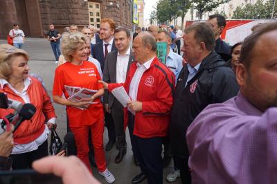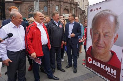 На Тверской улице была представлена агитационная продукция следующих кандидатов в депутаты Государственной Думы: члена Президиума, секретаря ЦК КПРФ С.П. Обухова, первого секретаря МГК КПРФ В.Ф. Рашкина, секретаря МГК КПРФ Д.А. Парфенова, руководителя Всероссийского женского союза «Надежда России» Н.А. Останиной, секретаря МГК КПРФ Н.Ю. Волкова, М.С. Лобанова, Е.Г. Гуличевой, М.А. Таранцова, С.Б. Курганского, А.В. Гребенника, И.В. Ульянченко, а также кандидата в депутаты Московской городской Думы, первого секретаря МГК ЛКСМ РФ Д.А. Багиной.