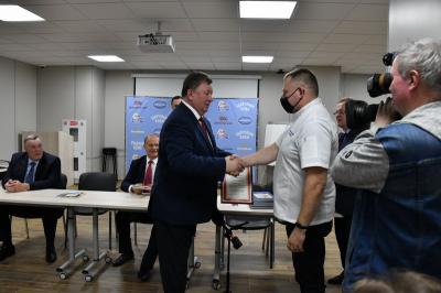 Затем спортсменов поприветствовал В.И. Кашин. Владимир Иванович отметил большой вклад Б.В. Иванюженкова в строительство спортивного комплекса в Подольске. Затем состоялась церемония вручения наград трудовому коллективу спортивного комплекса.