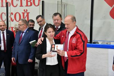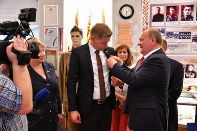 Г.А. Зюганов наградил памятной партийной наградой руководителя школьного музея, учителя географии П.Е. Красновида.