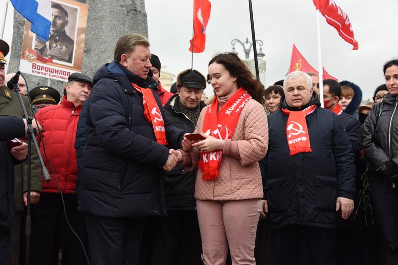 После выступления В.И. Кашина состоялось торжественное вручение партийных и комсомольских билетов. Зампредседателя ЦК КПРФ тепло поздравил новое пополнение партии и комсомола.