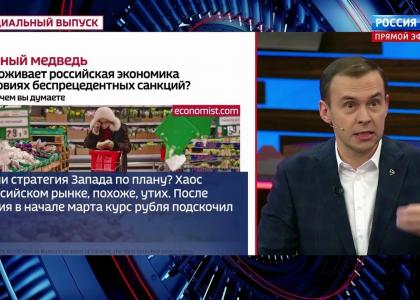 Одним из сюжетов программы стала статья в журнале Economist, входящем в число самых авторитетных экономических изданий мира. Статья под названием «Раненый медведь» описывает состояние российской экономики в условиях западной санкционной войны. Автор статьи, пусть и с удивлением, указывает: курс рубля к доллару почти вернулся к уровню, который имел место до введения массированных западных санкций. Юрий Афонин констатировал: это вполне ожидаемый результат того, что из России в последние недели практически прекращен вывод капитала.