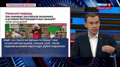 Одним из сюжетов программы стала статья в журнале Economist, входящем в число самых авторитетных экономических изданий мира. Статья под названием «Раненый медведь» описывает состояние российской экономики в условиях западной санкционной войны. Автор статьи, пусть и с удивлением, указывает: курс рубля к доллару почти вернулся к уровню, который имел место до введения массированных западных санкций. Юрий Афонин констатировал: это вполне ожидаемый результат того, что из России в последние недели практически прекращен вывод капитала.