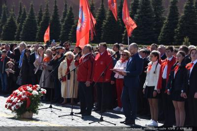 На площадь выносятся Знамя Победы и Знамя Всесоюзной пионерской организации имени В.И. Ленина. Командир сводного пионерского отряда Георгий Бондарев отдает рапорт почетному Председателю пионерской организации Г.А. Зюганову. Затем Геннадий Андреевич обращается к участникам торжественного Сбора: