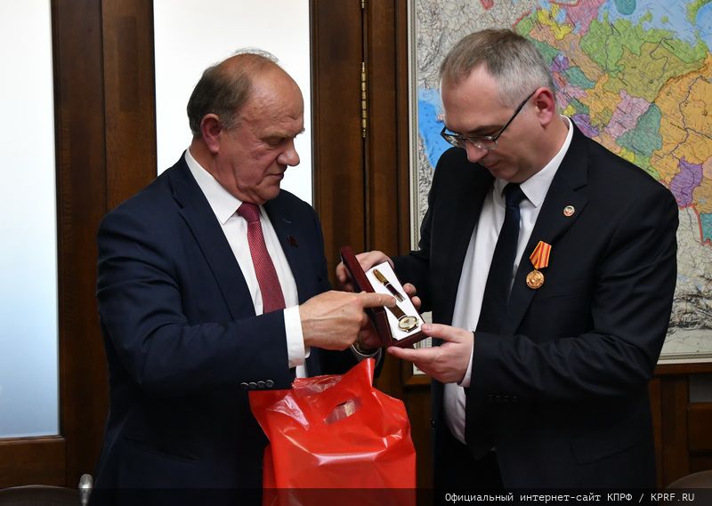 Лидер КПРФ Г.А. Зюганов вручил членам делегации ДНР памятные медали ЦК КПРФ "100 лет образования СССР".