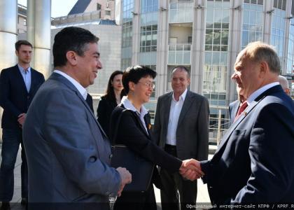 Лидер КПРФ Г.А. Зюганов вручил памятные подарки с символикой КПРФ советнику-посланнику по культуре посольства КНР в России, директору китайского культурного центра в Москве Гун Цзяцзя и генеральному директору Международной издательской медиагруппы «Шанс» Му Пину. Китайские товарищи подарили лидеру КПРФ Г.А. Зюганову и Д.Г. Новикову книги на русском языке по истории Китая.