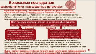 И тот и другой сценарий общественного ответа на неэффективность власти будет повышать внутриполитическую турбулентность и тактически вынудит «партию власти» метаться, реагировать на общественное недовольство и лавировать. Возможные ошибки в этом лавировании или отсутствие реакции на острые запросы общества будут катализировать разрастание слоя «рассерженных патриотов».
