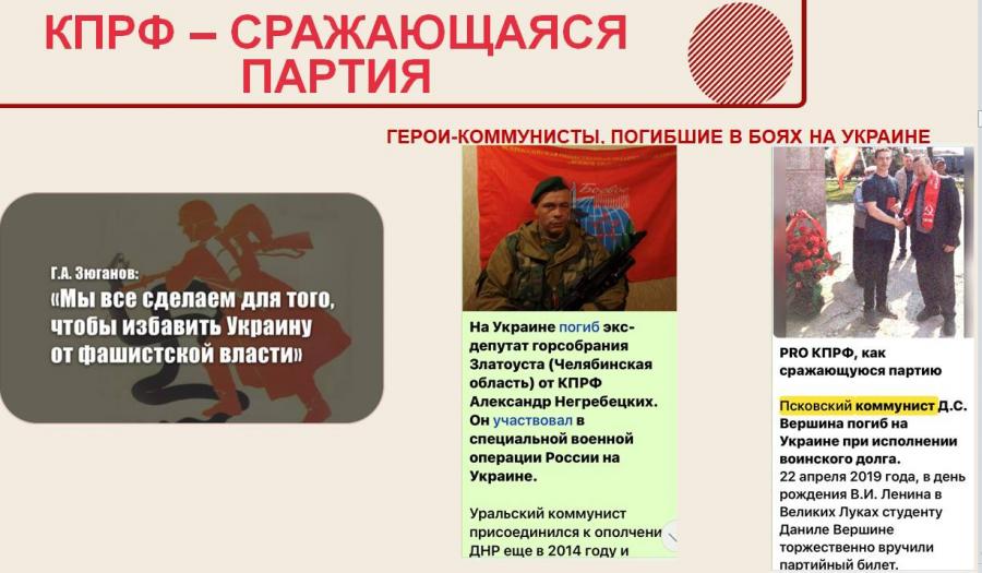 Напомнил, что из всех парламентских партий лишь КПРФ - единственная сражающаяся партия. Уже двое членов КПРФ - Данила Вершина из Пскова и Александр Негребецких из Челябинской обл. - погибли смертью храбрых на Украине в ходе СВО.