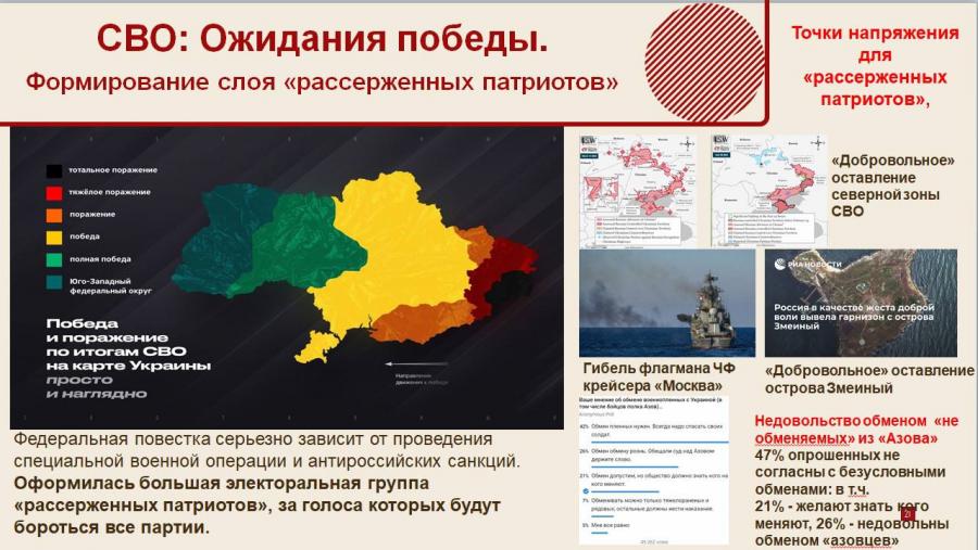 Заметно нарастание напряжения у «рассерженных патриотов» на фоне все большего проявления разного рода «договорняков» в интересах олигархических кланов и информационных провалов при освещении СВО. А именно: кейсы обмена нацистки «Тайры», обмены якобы необмениваемых «азовцев», искусственные «сложности» для добровольной помощи СВО, произвол на таможне, сдача Змеиного и т.д.