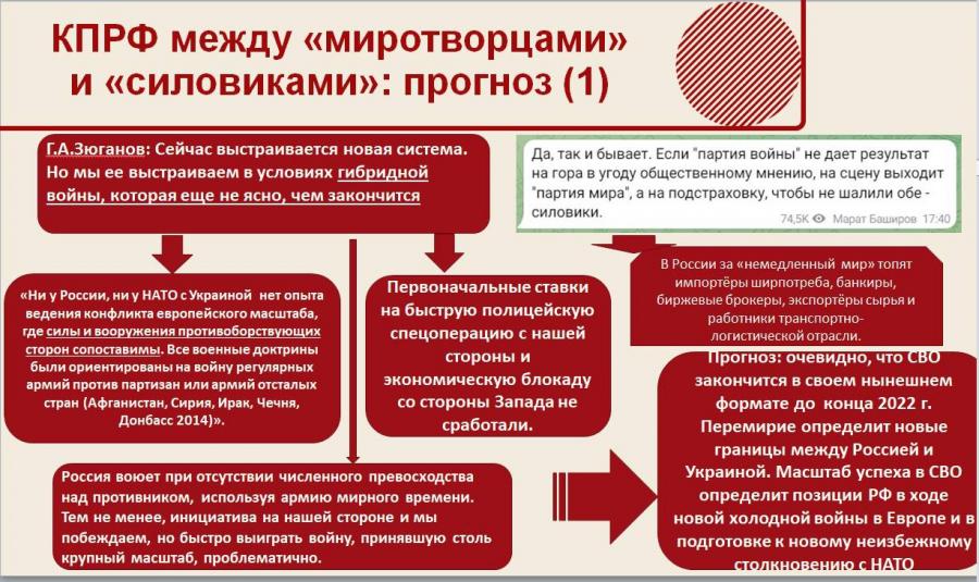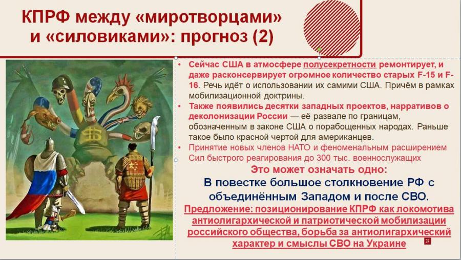 В этой связи высказал предложение: обсудить позиционирование КПРФ как локомотива антиолигархической и патриотической мобилизации российского общества. Плюс активизацию борьбы за антиолигархический характер и смыслы СВО на Украине.