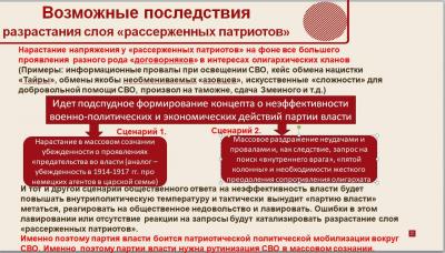 Такие инфоповоды ведут к подспудному формированию концепта о неэффективности военно-политических и экономических действий партии власти. В таких условиях возможны два сценария.