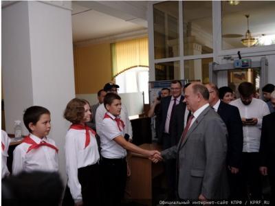 Почетных гостей встретила директор Дворца пионеров Н.А. Матушкина. Она познакомила лидера коммунистов с историей детского учреждения, основанного в 1924 году, а также продемонстрировала экспонаты выставки, посвященной пионерии. Участники мероприятия прослушали на старом патифоне запись обращения И.В. Сталина к народу 9 мая 1945 года. Г.А. Зюганов пообщался с пионерами, выстроившимися для приветствия в линейку.