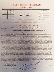 Председатель ЦК КПРФ Г.А. Зюганов направил в связи с этим поздравительную телеграмму в адрес ленинградских коммунистов.