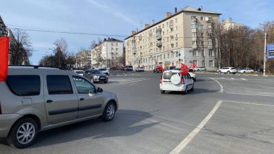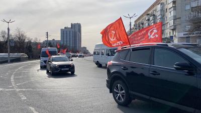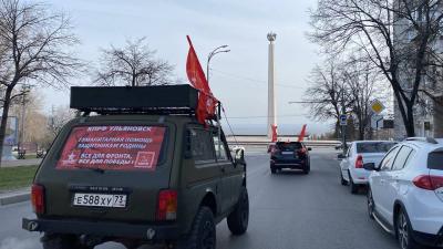 Гуманитарный груз до федеральной трассы, по главным улицам Ульяновска сопроводила колонна автомобилей с советскими флагами и флагами КПРФ, Знамёнами Победы.