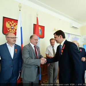 Лидер российских коммунистов также вручил памятные медали ЦК КПРФ «80 лет Орловско-Курской битве» ветеранам спорта В.А. Зубову, А.М. Афиногенову и начальника Управления физической культуры и спорта Орловской области А.И. Берестову.