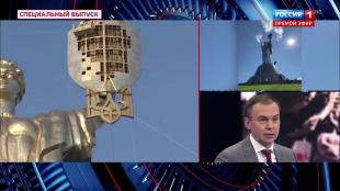 Юрий Афонин указал на символическое значение перемены гербов на самом известном монументе Украины. Советский герб – сугубо мирный. Колосья символизируют созидательный труд и изобилие, серп и молот – союз рабочих и крестьян, земной шар – мир во всем мире, дружбу народов, ленты с надписью «Пролетарии всех стран, соединяйтесь» на 15 языках – солидарность трудящихся. А тризуб чаще всего трактуется как оружие. Да, это древний символ, восходящий к личным знакам некоторых князей династии Рюриковичей. Но, сказал Юрий Вячеславович, свастика до Гитлера тоже была всего лишь безобидным древним символом солнца. Однако после Гитлера она – символ чудовищных преступлений и человеконенавистнической идеологии. Так и с тризубом. Он был эмблемой гитлеровских пособников – украинских коллаборационистов, которые под началом немцев сожгли вместе с жителями Хатынь и сотни других деревень, а также учинили Волынскую резню и огромное множество других злодеяний. Уже поэтому после этого никакое нормальное государство не стало бы использовать тризуб как свой герб.